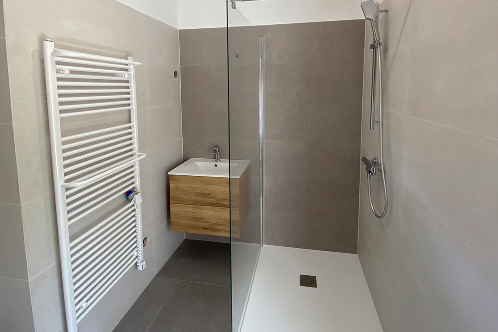 Az egyedi tervezésű fürdőszoba padlója 60x60 cm-es, a falazata pedig 35x100 cm-es burkolattal lett kialakítva. Ezúttal nem az oly népszerű és elterjedt padlóban elrejtett folyókát használtunk, hanem a megrendelői igényeket kiszolgálva egy 90x120 cm méretű egyedi zuhanytálca és egy nagy, 120x210 cm-es üvegfal került beépítésre.
